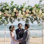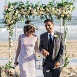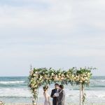 With less than 175 guests, their intimate beach ceremony faced the calming ocean and featured a beautiful white birch wedding arch adorned with cafe au lait dahlias, quicksand and tibet roses, cream astilbe and hydrangea, plum scabiosa and a variety of greenery including jasmine vine, Italian ruscus, lemon leaf and dusty miller. The setting September sun created a warm glow and the couple recited their vows and became man and wife.