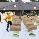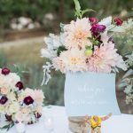 We typically see brides and grooms embrace florals for their escort card tables, but Shelley and Safa had a different idea in mind to welcome guests to the reception. Instead of traditional place cards, tequila shots awaited each guest with a lime wedge and their names displayed on toothpicks, which looked like little sailboats! It was definitely a fun and silly way to welcome guests into a night of great food and dancing. A miniature Hulk Hogan also made a few appearances, our favorite in which he held up a sign encouraging guests to take pictures on disposable cameras and sign the couple’s guestbook! The reception featured beautiful and large low centerpieces to keep the space intimate. Sitting atop low birch cylinder vases, we arranged cafe au lait and plum dahlias, quicksand and juliet roses, scabiosa flowers and pods, jasmine vine, dusty miller and Italian ruscus into a rustic and romantic centerpiece. Guests enjoyed their night on the dancefloor when a massive flash mob came out to get the party started!