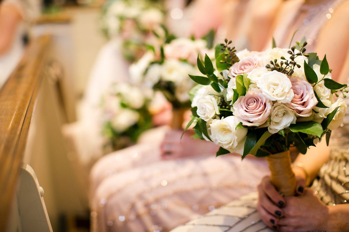 We chose several of our favorite specialty roses:dusty-blush Quicksand roses, warmer blush Keira roses, and pale-blush La Perla roses. Using a variations of a similar color adds depth, even to light-colored bouquets. Ranunculus, spray roses and garden roses, brought cream, ivory and white into the mix. A few sprigs of seeded eucalyptus accented the flowers.
