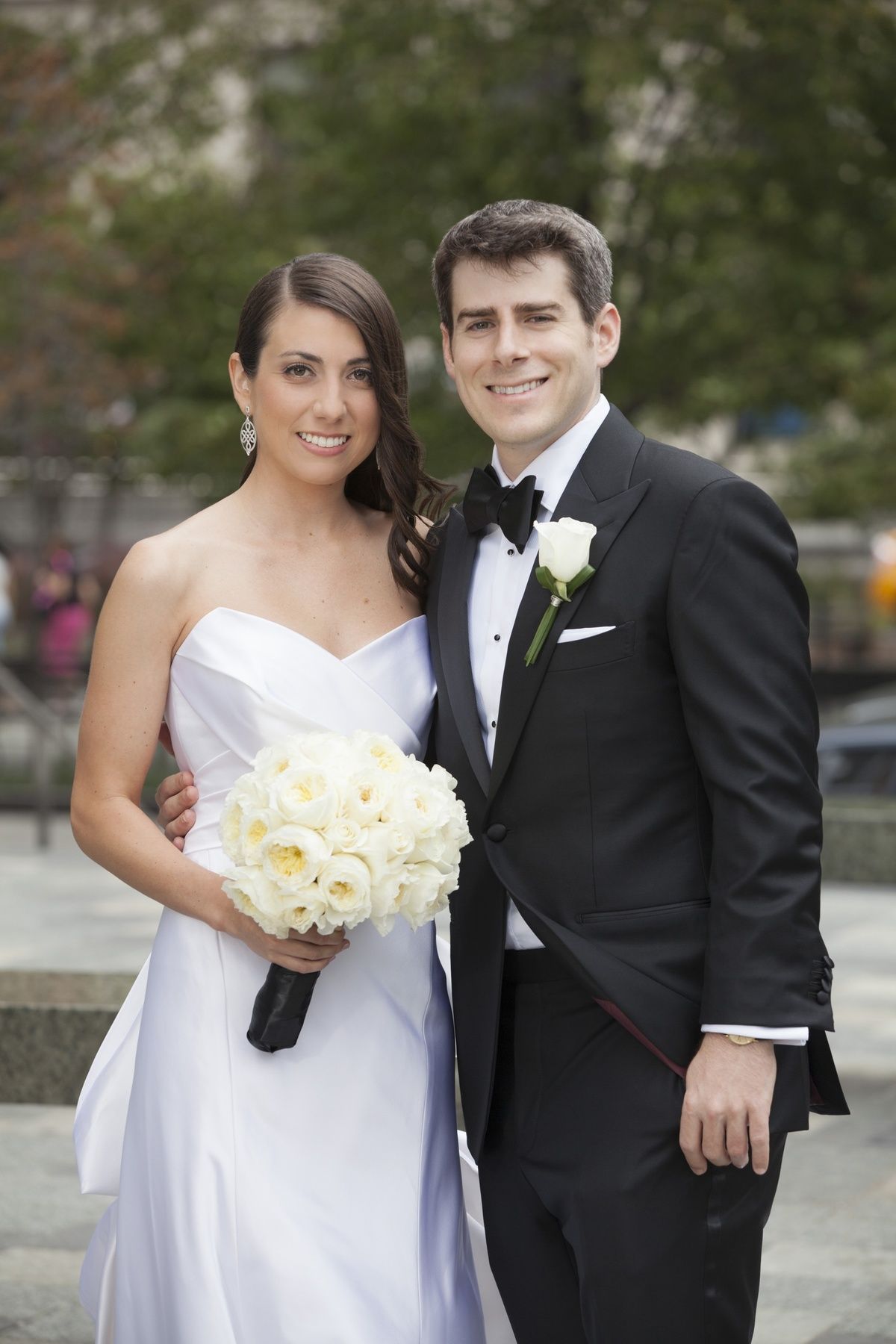 Katlyn and Phil’s wedding, at Manhattan’s Battery Gardens, was a study in chic minimalism. When we first spoke with this beautiful bride, she had a clear concept: simple elegance, with a black, white and champagne wedding-color scheme and all white wedding flowers. Her vision was well suited to Battery Gardens, a sophisticated Manhattan wedding venue with a stunning water view.