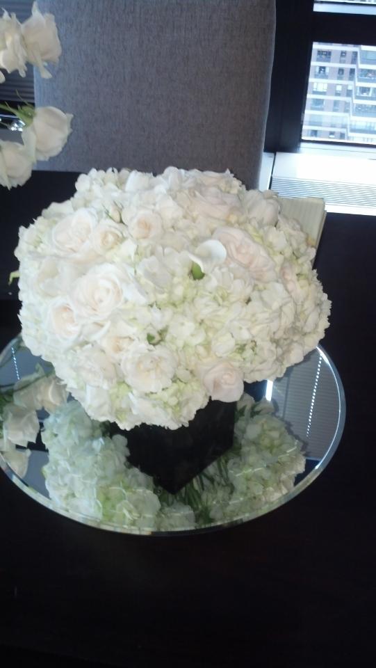 Here’s a sample we just did for a March bride. She choose all white flowers with a round, compact shape in a black cube vase for a classic look. We added a mirror underneath to illuminate the arrangement and give it a dash of elegance once candles are added.