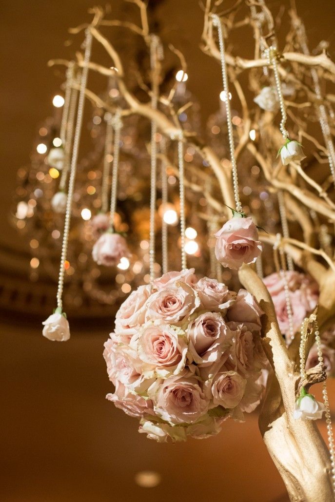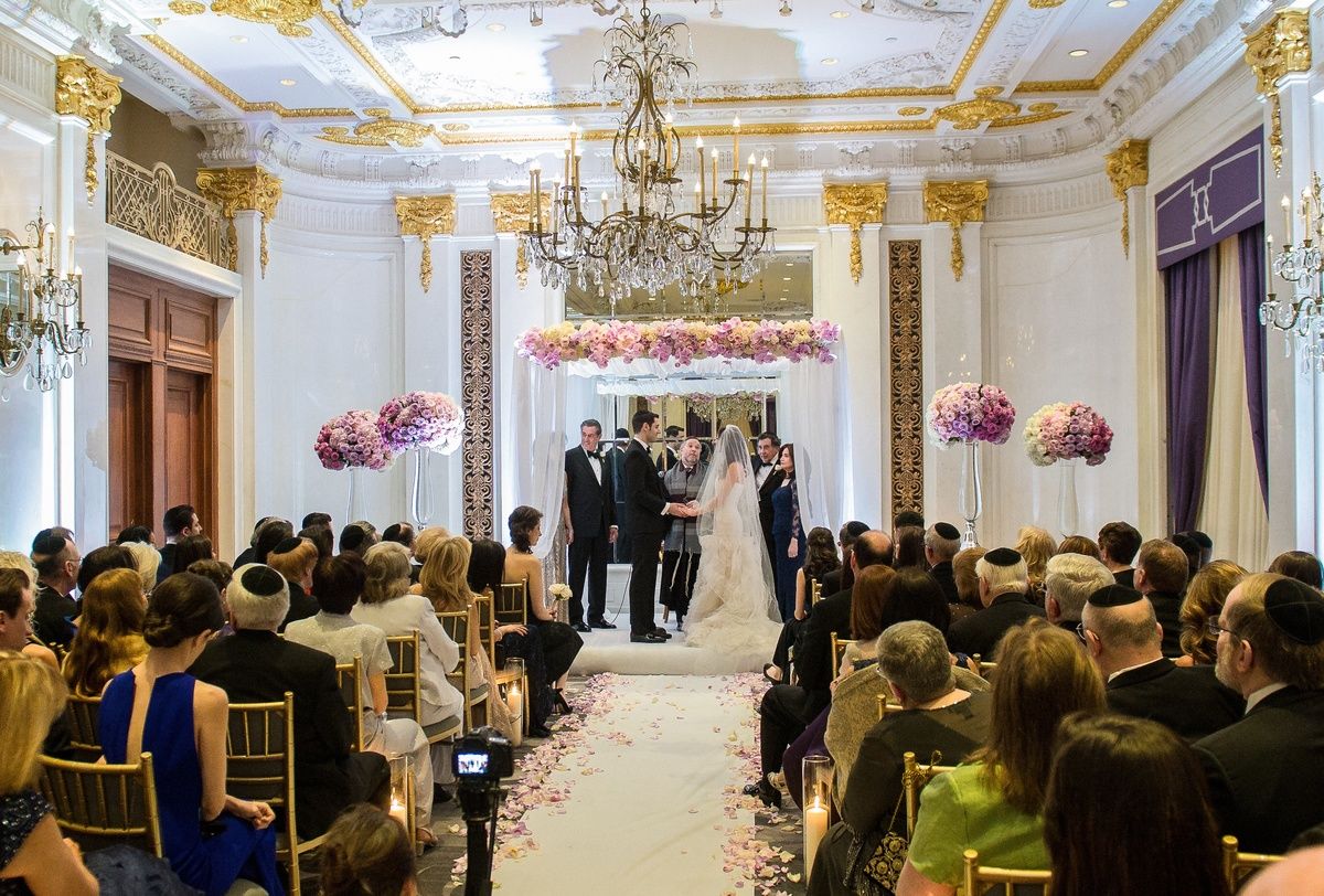 For the traditional Jewish ceremony, we created a four posted chuppah, elegantly draped in white chiffon, with a lush line of florals along the top. Candlelit blush, cream and lavender rose petals lined both sides of the aisle. Gilt chandeliers and soaring ceilings in The St. Regis Roof, a Beaux Arts Ballroom, called for tall, couture-look centerpieces. Flowers including Cool Water and Ocean Song roses were carefully arranged to create a chic ombre effect, from cream to blush, to pale pink, to deeper lavender.