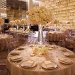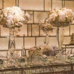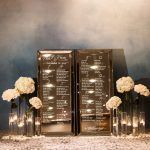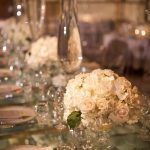 After the ceremony, guests headed to the lavish Park Hyatt for the reception. The new hotel’s modern ballroom is the perfect mix of Art Deco and contemporary elegance. With backlit onyx walls, the all-white room radiates with warmth. Ina and Kevin opted for a set of beautifully calligraphed mirrors as their seating chart. We added mixed height clustered arrangements next to the mirror, featuring ivory spray roses, cream vendela roses and white hydrangea with pillar and floating candles to warmly welcome guests.