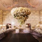 Jaws dropped as everyone entered the Onyx room. In the middle of the dance floor was a dramatic 8-foot floral chandelier. This herculean structure was composed with over 1000 blooms including white hydrangea, cream vendela roses, white stock and white dendrobium orchids. The chandelier was magically lit with hanging bubble terrariums with tea lights inside.