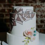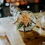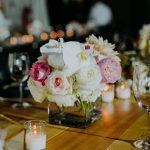Tiffany and Ashley carried geometric shapes throughout several of the wedding details to bring cohesion to the decor. It started with a gorgeous geometric invitation by Amanda Day Rose. Interlocking triangles and squares were repeated on table numbers, menus, signage, the wedding cake. For the tablescape, we designed a mixture of pastel toned cafe au lait dahlias, ranunculus, garden roses and Phalaenopsis orchids in terrarium and square glass vases that created a rustic feel across their long tables.